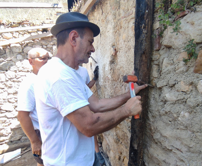À l'autre bout du jardin, Vincent, Alain, Richard et Roland s'attaquent à la reconstruction du cabanon.